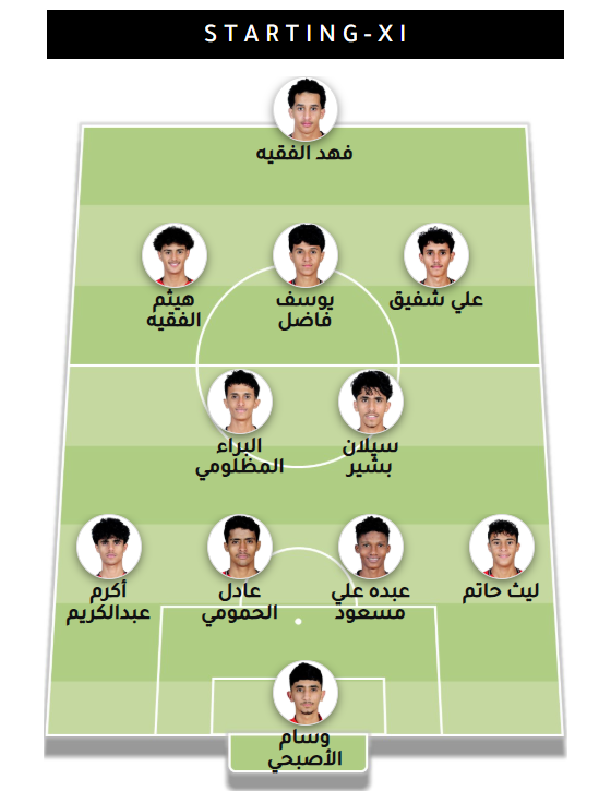 بدأ المدرب هيثم الأصبحي بتشكيلة مغايره عن المباراة السابقة حيث قام بإشراك أربعة لاعبين جدد وتكونت التشكيلة من :